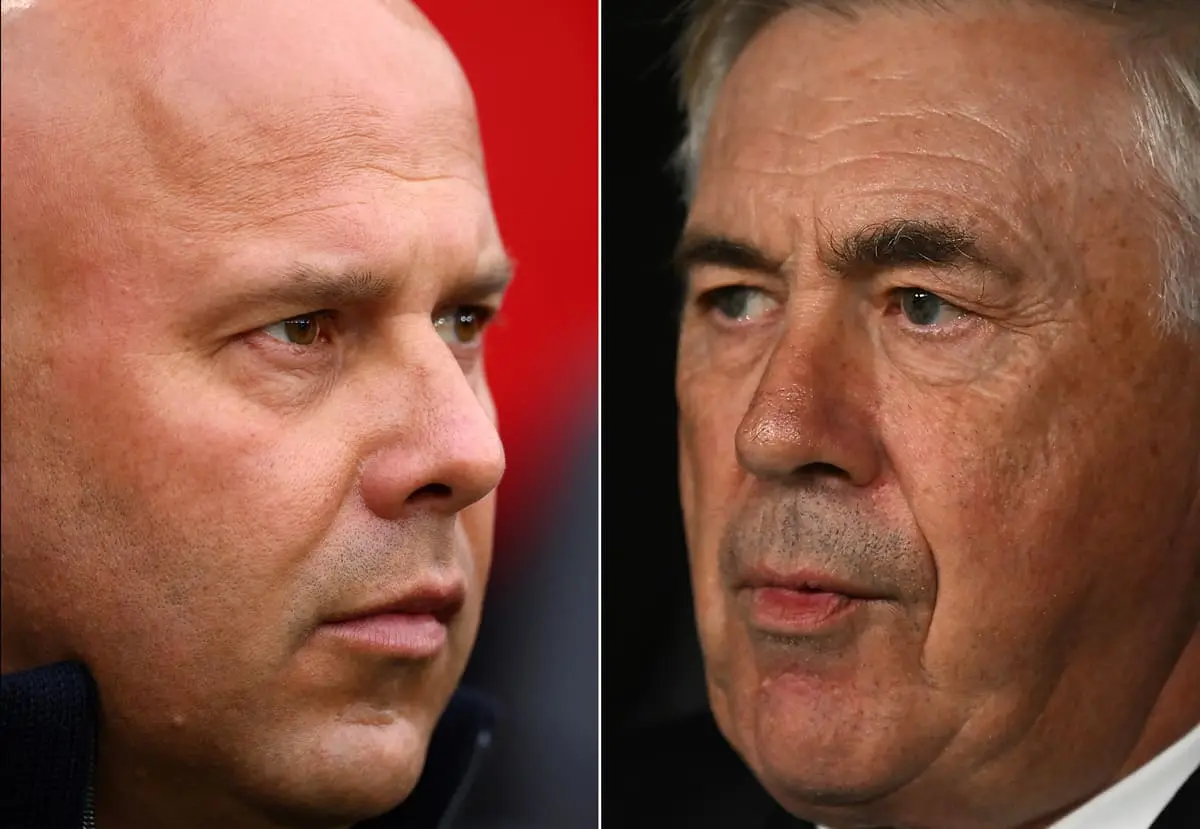 Arne Slot, entraineur de Liverpool et Carlo Ancelotti, entraineur du Real Madrid (Photo by Dan Istitene/Getty Images) (Photo by Denis Doyle/Getty Images)