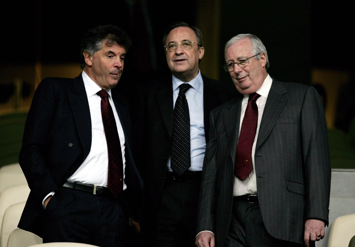 MADRID, SPAIN - FEBRUARY 21: Real Madrid's President Florentino Perez (C) talks with Arsenal Vice-Chariman David Dein (L) and Chairman Peter Hill-Wood (R) before the UEFA Champions League Round of 16, First Leg match between Real Madrid and Arsenal at the Santiago Bernabeu Stadium on February 21, 2006 in Madrid, Spain. (Photo by Richard Heathcote/Getty Images)